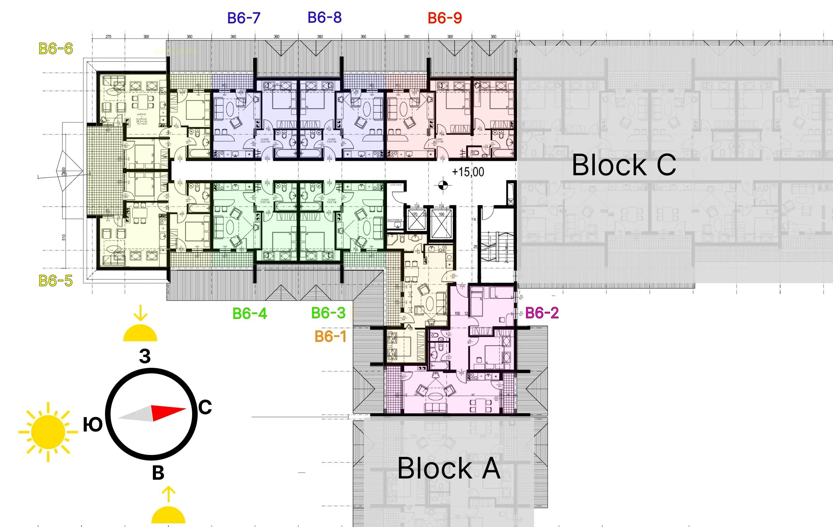 Комплекс состоит из четырех секций А, B, C, D и SPA центра с бассейном и спортивными сооружениями, с магазинами, офисами, лобби баром, рестораном с пиано-баром, конферентным блоком и подземным паркингом. По типу объекта «ЛАУНРОКС» является жилым зданием для круглогодичного обитания с апартаментами и студиями. Для всех секций предвидены пять основных этажей и один подпокрывный с террасами, отличающийся не только лучшими видами, но и нормальными бетонными перекрытиями потолков с утеплением минеральной ватой, над которыми расположен чердак и крыша.